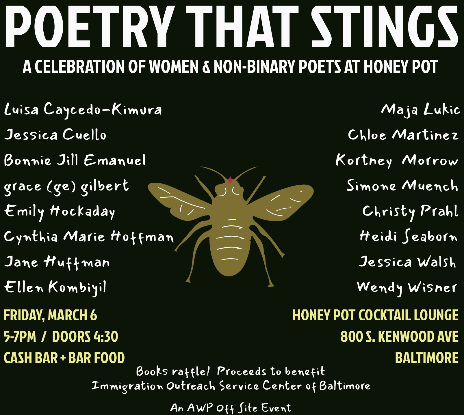 March 6th 5-7 POETRY THAT STINGS: A Celebration of Women and Nonbinary Poets at Honey Pot, 800 S Kenwood, Baltimore